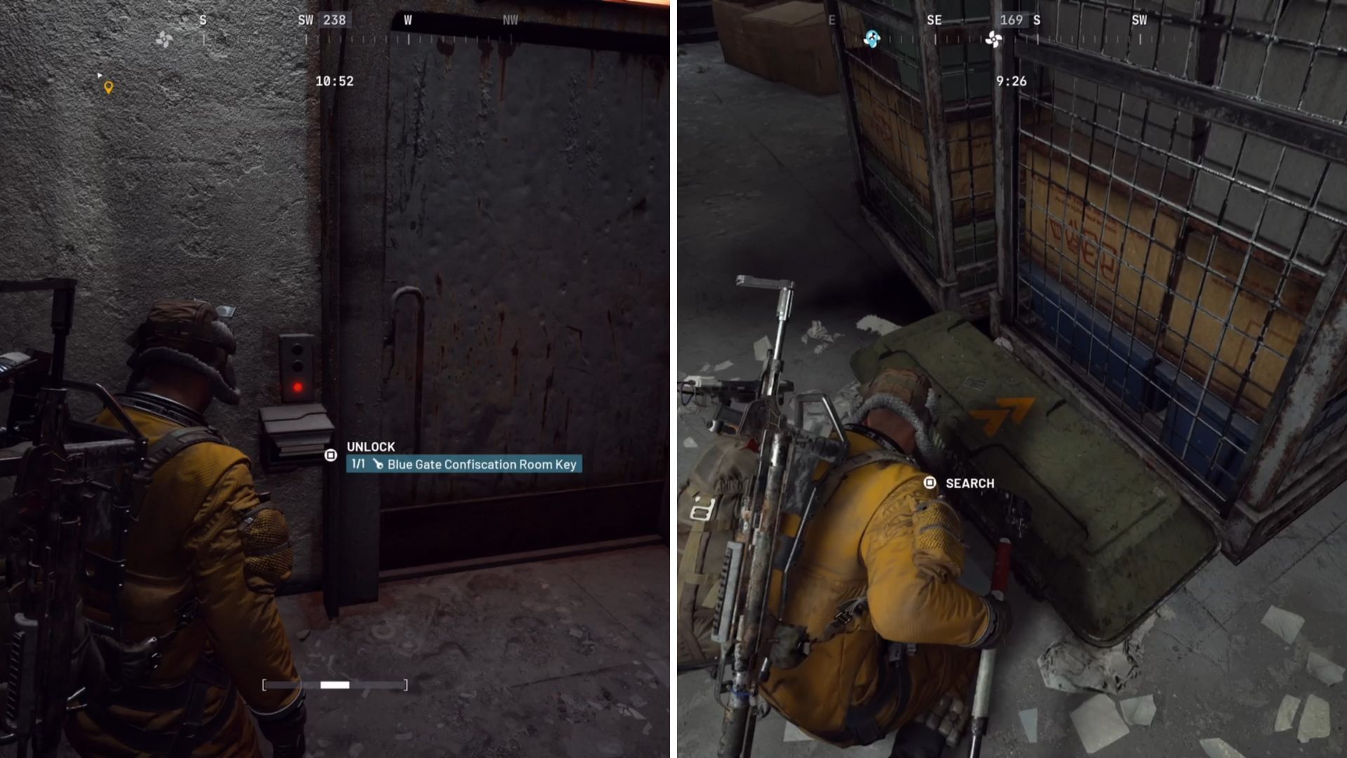 Поверните налево и двигайтесь на северо-запад, пока не увидите будку охраны, затем проедьте мимо неё. Слева вы найдёте небольшую лестницу, ведущую вниз в нужную вам комнату – это та, что открывается ключом Blue Gate Confiscation Room key.
