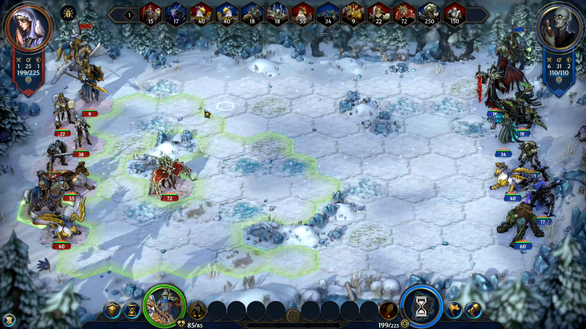 Я намеренно участвовал в боевых сценариях, чтобы оценить свои юниты, протестировать заклинания и лучше понять, как работает игра. Когда начинается битва, ваши юниты выстраиваются на одной стороне, а вражеские – на другой, каждый действует по очереди, основываясь на своей инициативе, которая отображается на временной шкале в верхней части экрана. У каждого юнита уникальное поведение – некоторые бойцы ближнего боя, другие атакуют на расстоянии, некоторые могут телепортироваться, другие используют атаки с эффектом области, и у многих есть специальные способности. Эти дополнительные стратегические элементы делают игровой процесс еще более увлекательным.