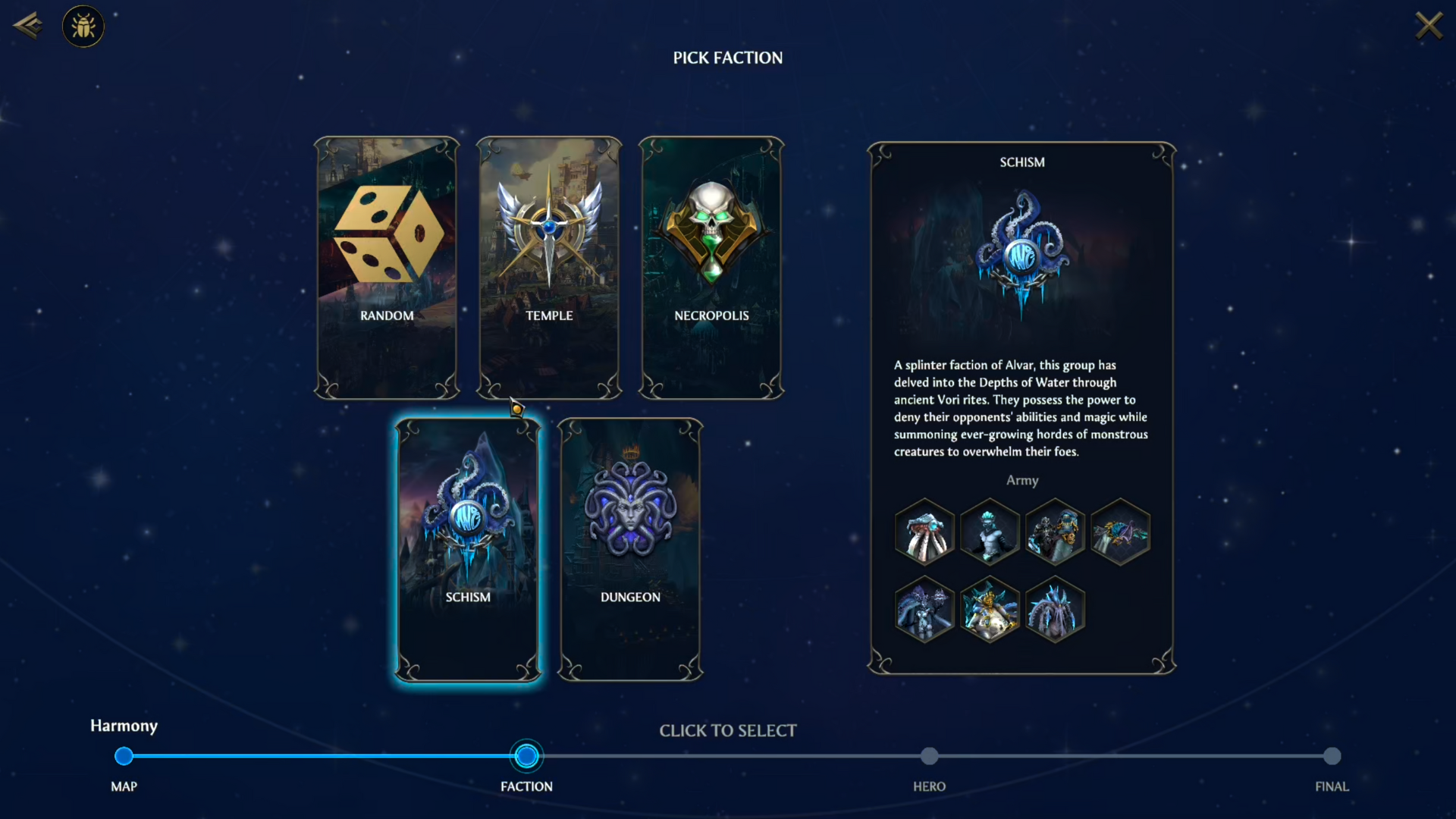 Я начал играть за фракцию Храма – людей, получающих полезные усиления. Затем я переключился на мою любимую, Подземелье, которое является домом для магических существ и тёмных эльфов. Я также попробовал Некрополис, с его слабыми, но раздражающими юнитами, и новую фракцию Раскол, чьи существа из глубин моря напомнили мне о Cthulhu.