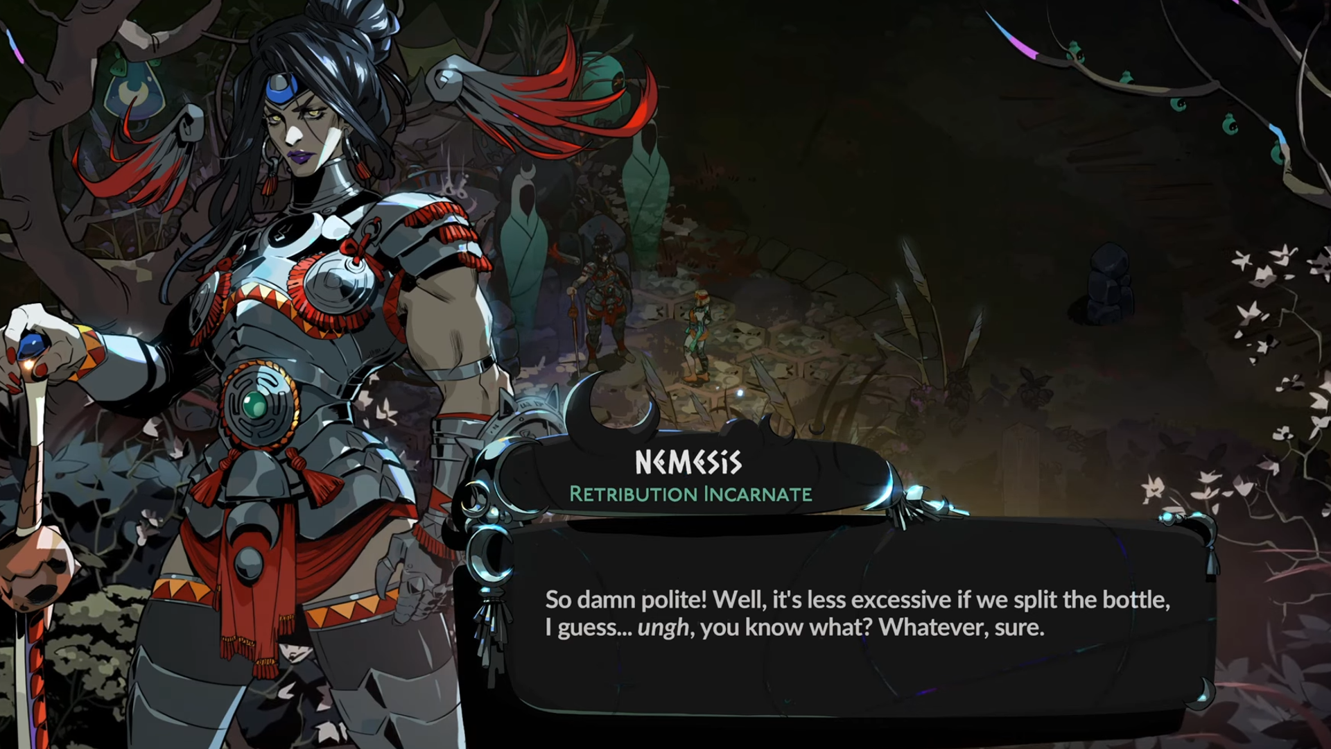 Вы, вероятно, уже знаете, как это работает: если вы достаточно сблизились с NPC на Перекрёстке, они примут Амброзию и пойдут с вами выпить в Таверну. Если они ещё не готовы это сделать, продолжайте давать им Нектар, Соли для ванны или Двойные приманки, чтобы улучшить ваши отношения. Просто помните, что поход за выпивкой занимает 20 Whiles (единиц времени).