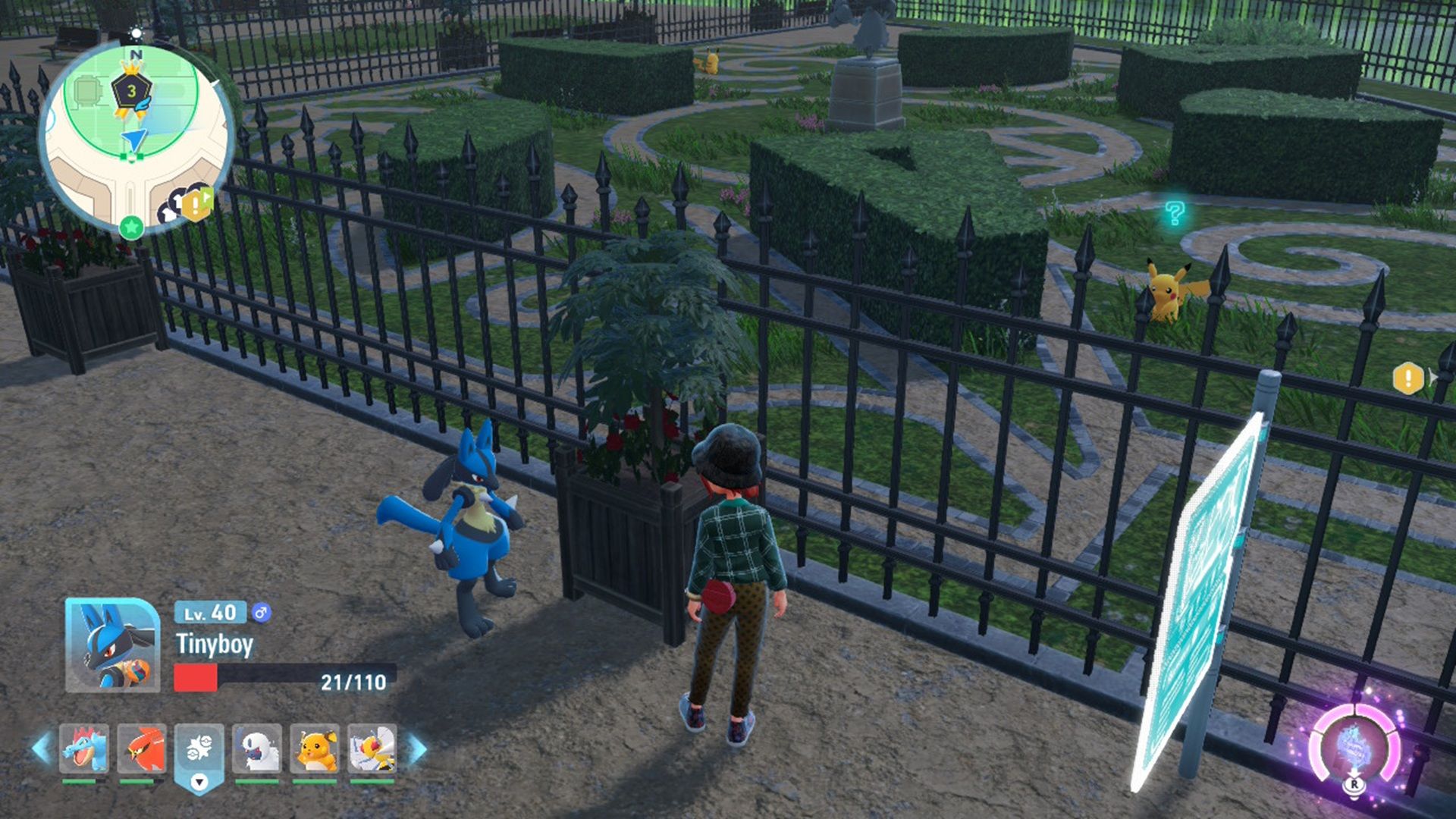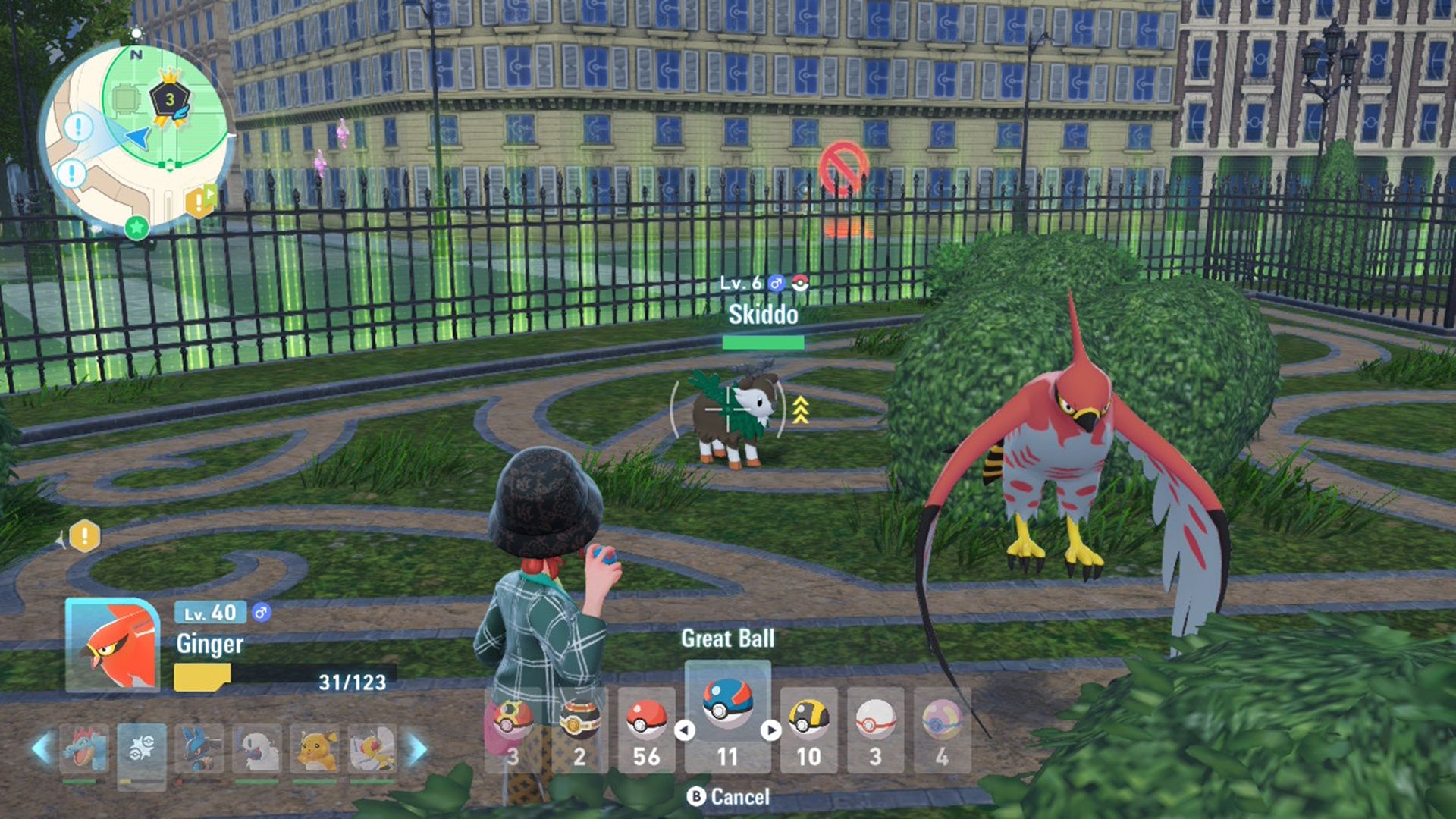 Окей, значит, после того, как вы поймали Пикачу возле того забора, направляйтесь немного левее. Вы увидите еще один вольер, где находится Скиддо – это травяной тип покемона, и отличный выбор для вашей коллекции!