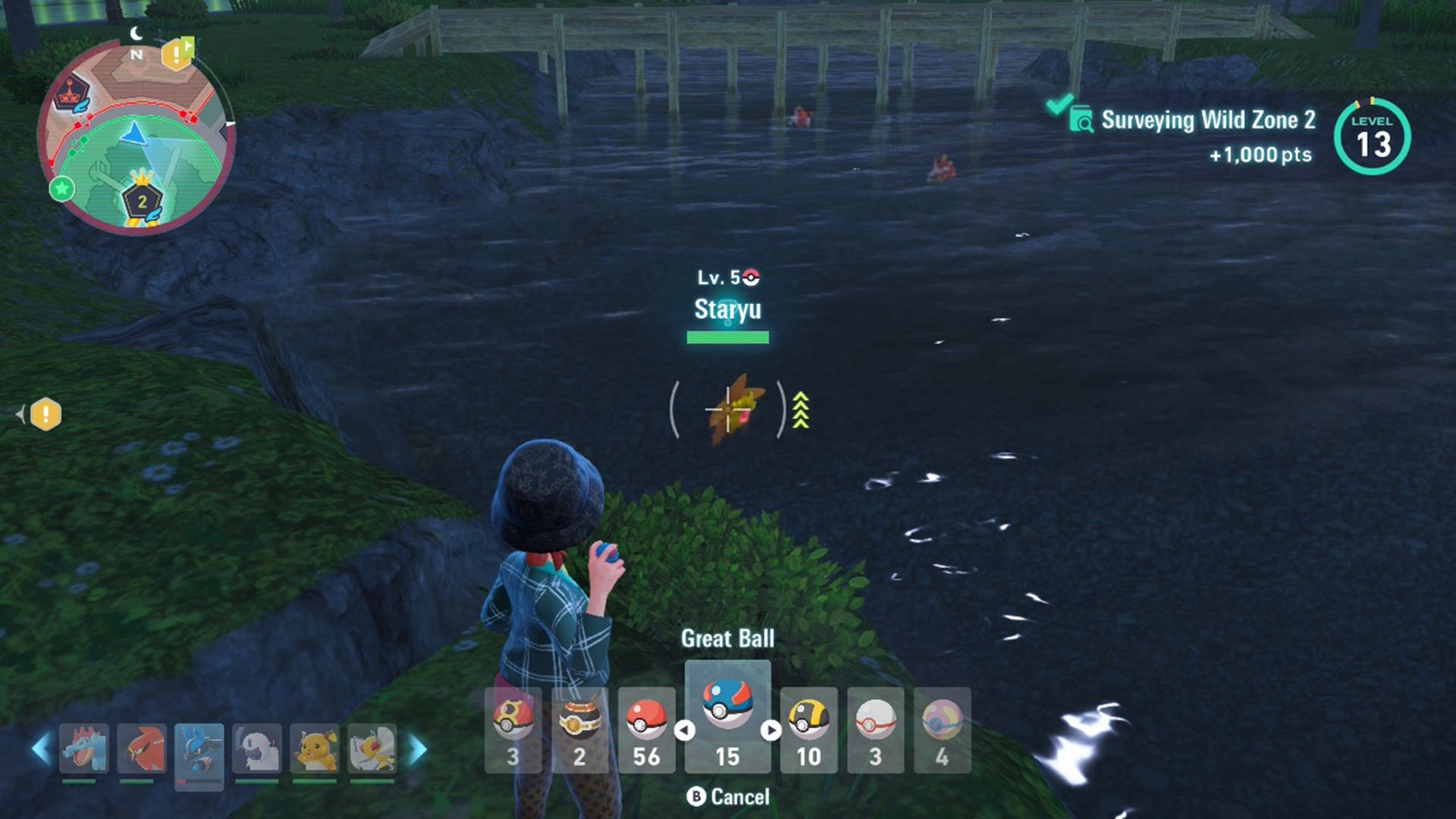 Вернитесь в Дикую Зону 2 и бегите к входу на дальнем конце. Вы найдете Staryu, появляющегося в нескольких местах в воде, что облегчит его поимку.