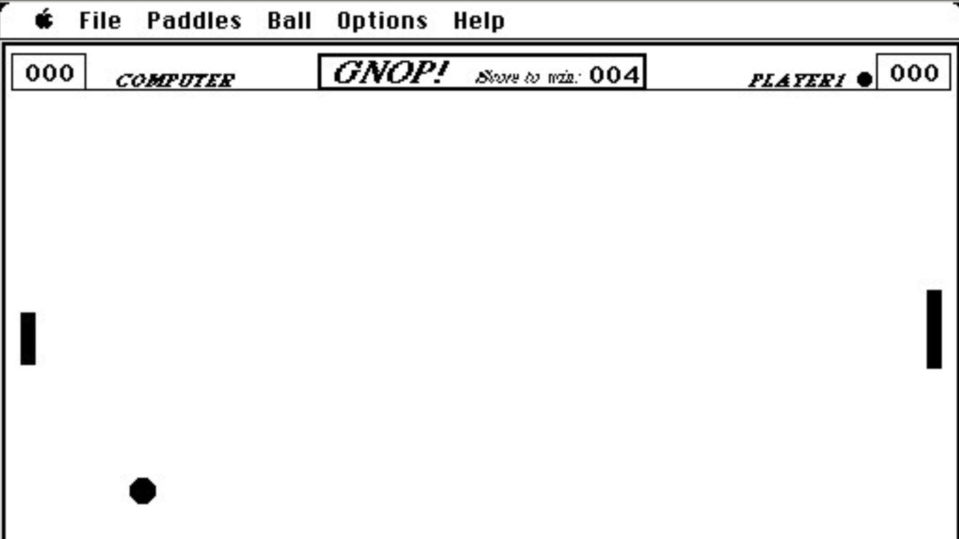 Gnop! была простой игрой, похожей на Pong. Она позволяла одному игроку соревноваться с компьютером и имела настраиваемые параметры, такие как размер весла и мяча, уровень сложности, скорость мяча и счёт для победы.